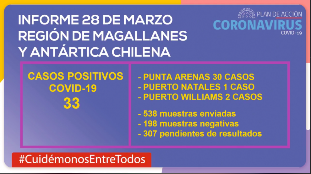 Treinta de los infectados están en Punta Arenas, dos en Puerto Williams y uno en Puerto Natales.